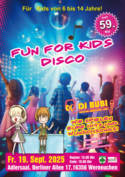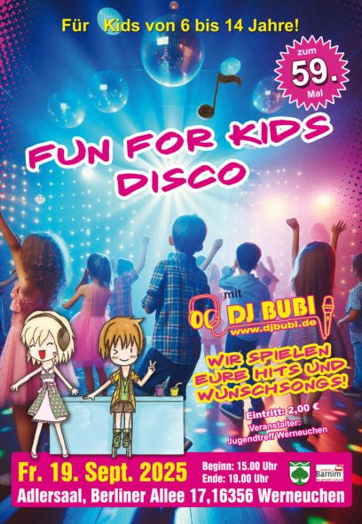 16.12. Fr. Fun For Kids Disco 45.03.12. Weihnachtsmarkt Werneuchen14.10. Fr. Fun For Kids Disco 44.27.08. Sa. Erntefest Danewitz (Tanz mit DJ Bubi)20.08. Sa. Sommerfest Seefeld06.08. Sa. 22. Sommerfest Willmersdorf05.08. Fr. 22. Sommerfest Willmersdorf16.07. Kinder und Dorffest Schönfeld04.06. Familiensportfest in Seefeld29.04. Fr. Fun For Kids Disco 43.26.03. Osterfeuer bei Leo Rink 2016